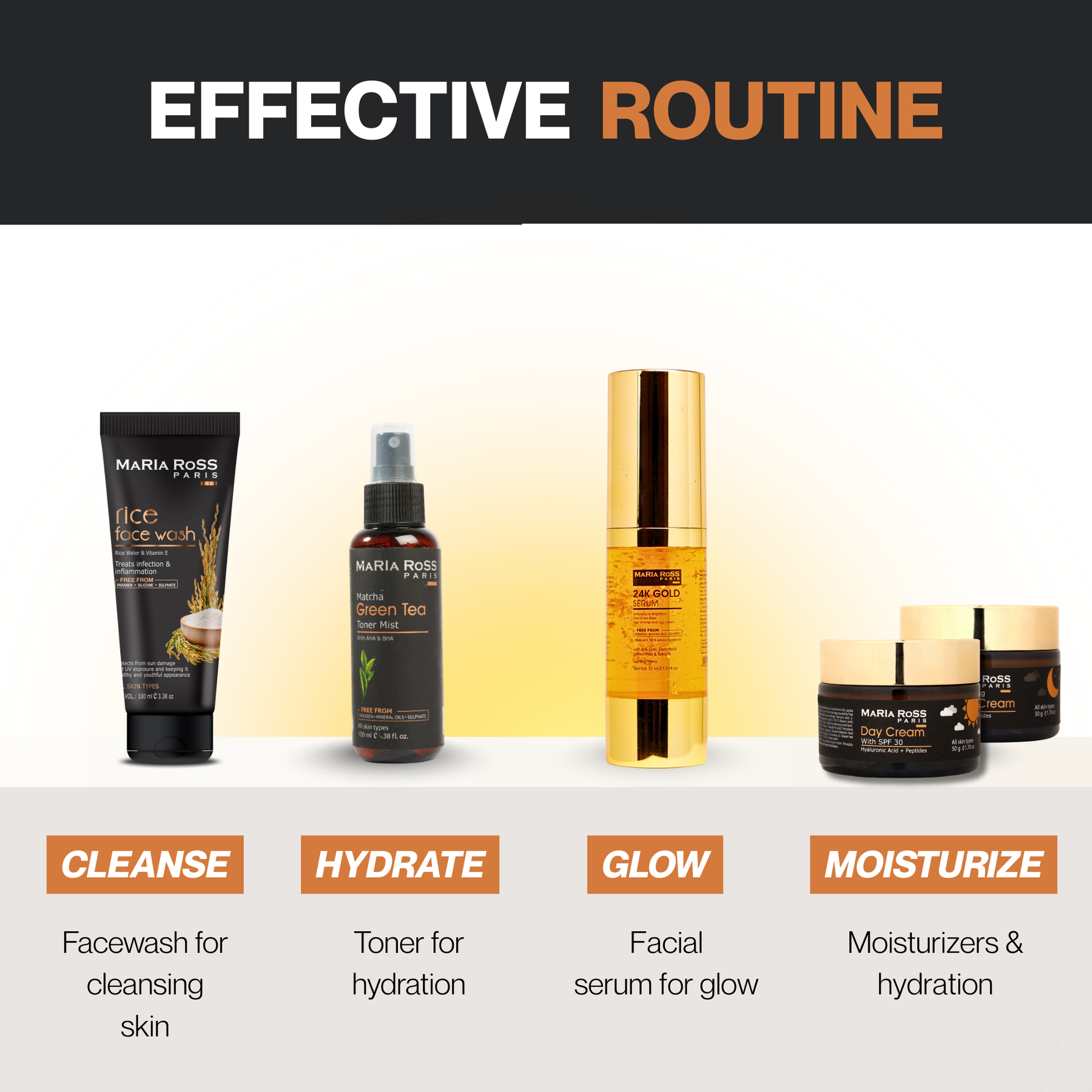 Maria Ross aims to make skincare elegant and simple at the same time, our products suit a diverse audience and mix up well with their skin types. We have each type of product whether you possess dry skin or oily one we have all the right options for you.